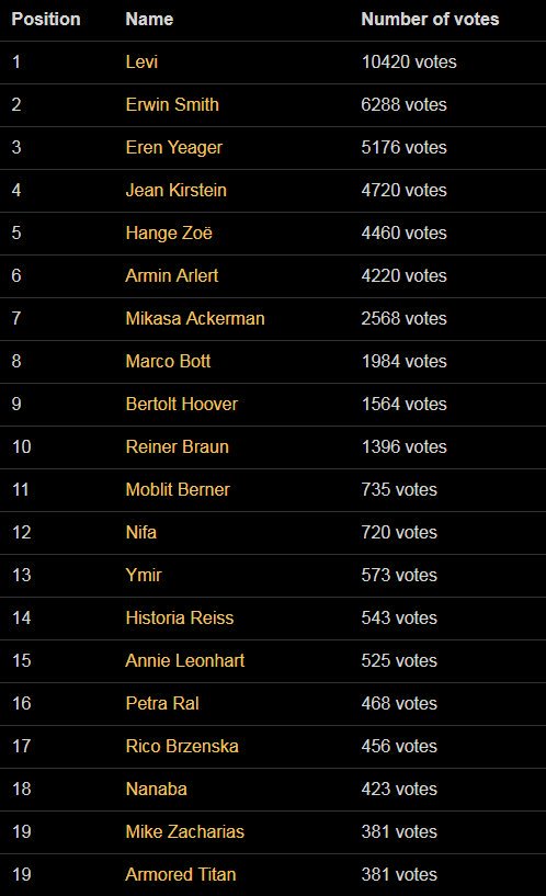 The poll received an overwhelming response as 100000 users participated in it to show their love for the anime. The results are in. So Levi really is more popular than Eren huh.
